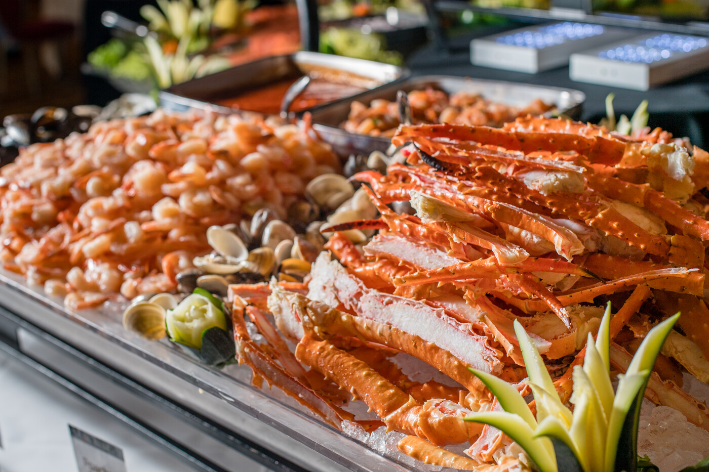 Feast on over 50 delectable dishes from around the world, from classic breakfast favorites to spicy southwestern treats and Asian-inspired delights. Don't miss our vibrant salad station or our legendary carving station, featuring succulent prime rib and mouthwatering smoked brisket. Indulge in fresh-made guacamole, a delightful assortment of sushi, creamy tortellini carbonara, and flavorful gnocchi alla pesto. Dive into our ocean bounty seafood station with snow and stone crab claws, king crab legs, and a classic, shrimp cocktail. For the sweet tooth, explore our abundant dessert selection. Plus, visit our omelet chef to customize your dish. Treat yourself to a brunch fit for royalty!
