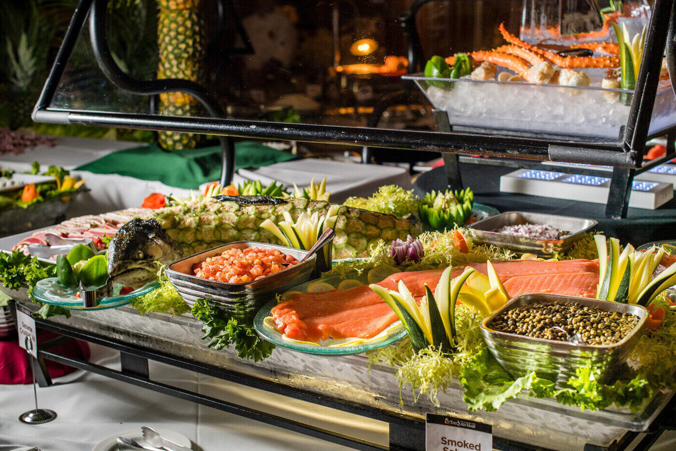 Feast on over 50 delectable dishes from around the world, from classic breakfast favorites to spicy southwestern treats and Asian-inspired delights. Don't miss our vibrant salad station or our legendary carving station, featuring succulent prime rib and mouthwatering smoked brisket. Indulge in fresh-made guacamole, a delightful assortment of sushi, creamy tortellini carbonara, and flavorful gnocchi alla pesto. Dive into our ocean bounty seafood station with snow and stone crab claws, king crab legs, and a classic, shrimp cocktail. For the sweet tooth, explore our abundant dessert selection. Plus, visit our omelet chef to customize your dish. Treat yourself to a brunch fit for royalty!